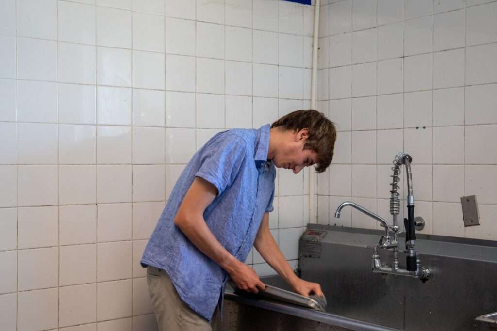 At home, his routine consisted of clearing a dish and letting the dishwasher take it from there. With no dishwasher at The Island School, George had to form a new routine.