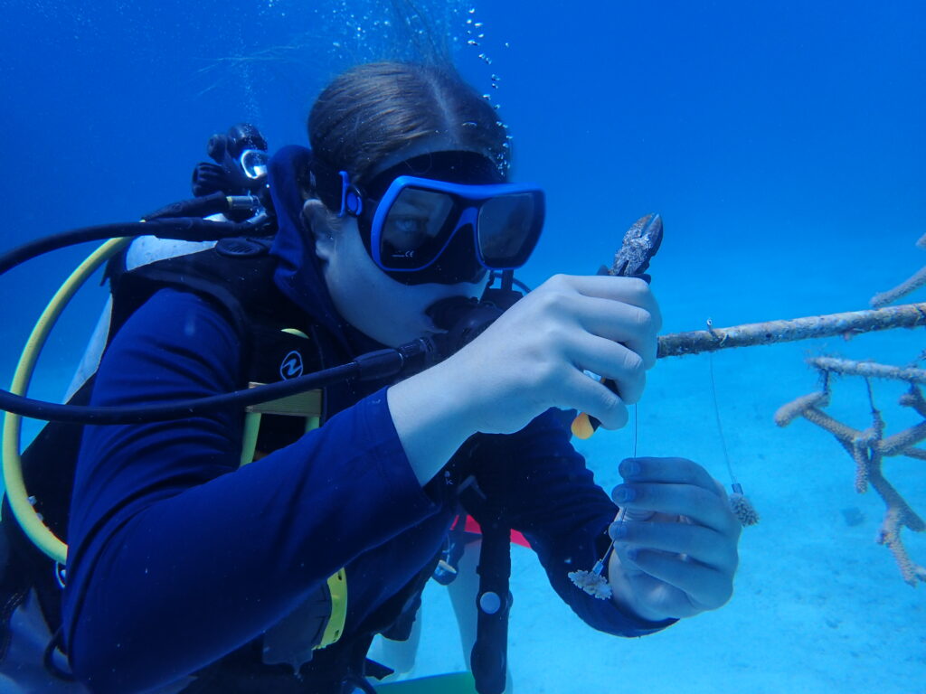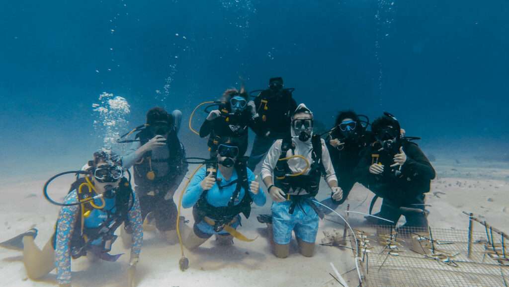 Figure 1: Semester students learning about ocean-based coral nurseries (left), how to propagate the corals (middle), and how to maintain the mid-water structures where corals are growing.
