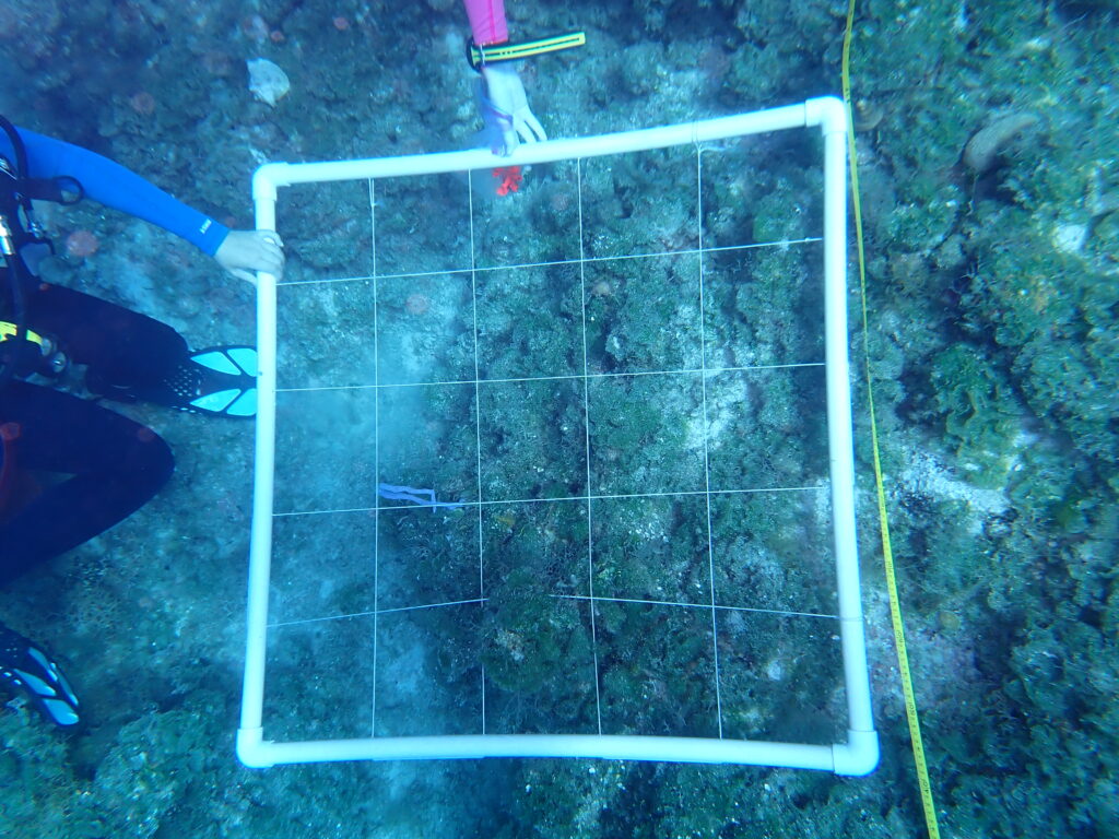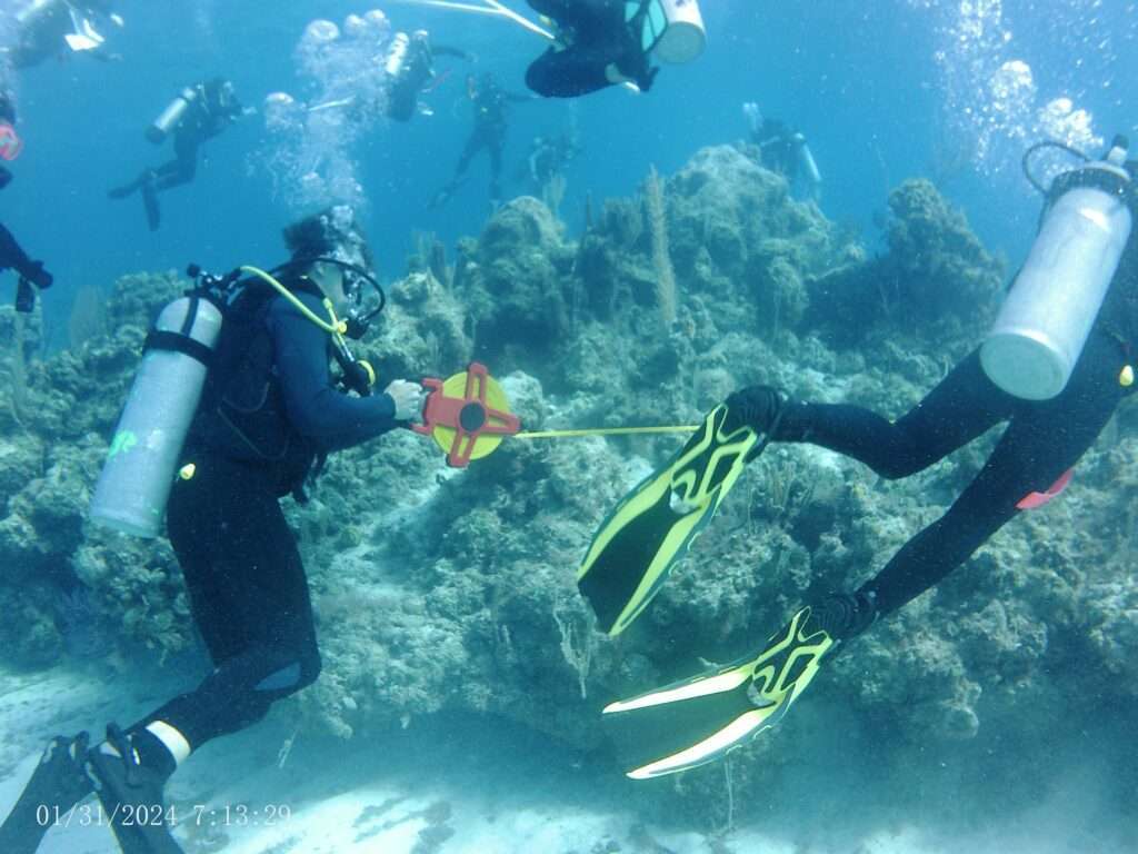 To conduct surveys on the status of coral juveniles located in southern Eleuthera, we collect data on weekly scuba dives. This is done by laying out 30 feet of a transect, which are guiding lines, and placing a 1m x 1m quadrant, small squares used to capture smaller parts of the reef, along the tape for the section laid down. If coral juveniles are found in an area, they are marked with a tag so that a member of our group can photograph the juvenile to allow us to create a generalized conclusion about the type, abundance, diversity of coral species, and see the amount of coral juveniles present. Based on the info from different reefs, we can analyze the data and infer certain conclusions about coral in Southern Eleuthera.
