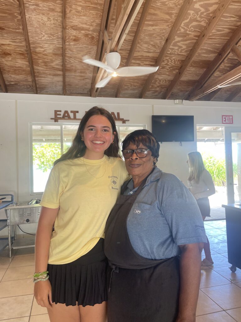 When asked about connections they have built outside of Semester, student Maeve Upton’s hand specifically (and metaphorically) shot up. Her relationship with Merlene (also known as “Mooch”), a long time member of The Island School’s kitchen team, has largely informed her time here. The kitchen has the biggest, most important job on campus: every single day, the eight people that make up the department feed over 100 community members breakfast, lunch, and dinner. Though the team is remarkably self-sufficient, they always appreciate any efforts to help out. One day, Maeve wandered through the silver door connecting the dining hall to the kitchen, and she has never looked back. She says ”[her] work in the kitchen has given [her] purpose,” and that “[her] connection with Mooch is special.” Mooch was beyond touched to hear Maeve’s testimony, placing her hands on her heart and calling Miss Upton “[her] girl.”