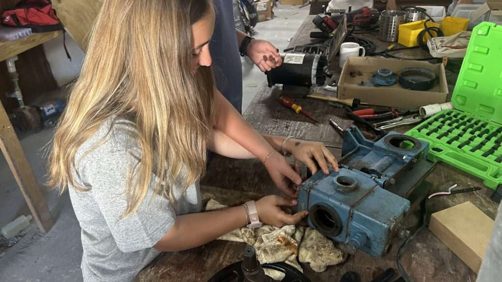 Next, we collected three old well pumps and used their parts to rebuild one working pump and wired an electrical box with a controller to connect and power our pump. We brought our materials to the agroforestry site and completed a site assessment to determine where to install our system.